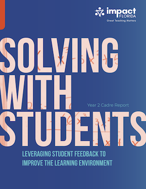 Launched in 2021, Solving with Students is Impact Florida’s first teacher-only learning cadre. It empowers secondary math teachers to gather and act on student feedback through cycles of reflection, strategy testing, and continuous improvement. Teachers use an anonymous survey tool to capture student perspectives, analyze results, discuss them with students, and adjust instruction accordingly, all while receiving coaching and support from coaches and peers.